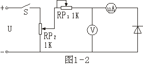 1、測(cè)正向特性。按圖1-1連接電路,PV用萬(wàn)用表2.5V檔,二極管用2AP,電流表用200mA。