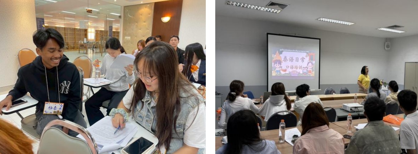 到達(dá)翁查瓦里功大學(xué)后,翁大老師首先給同學(xué)們開啟了泰語(yǔ)的啟蒙教學(xué)。從基礎(chǔ)會(huì)話到日常表達(dá),老師以生動(dòng)情境教學(xué)引導(dǎo)零基礎(chǔ)的同學(xué)快速融入。課堂互動(dòng)中,同學(xué)們不僅掌握了實(shí)用語(yǔ)言技能,更通過語(yǔ)言載體感知泰國(guó)禮儀文化與社會(huì)風(fēng)貌,為后續(xù)文化體驗(yàn)活動(dòng)奠定基礎(chǔ)。