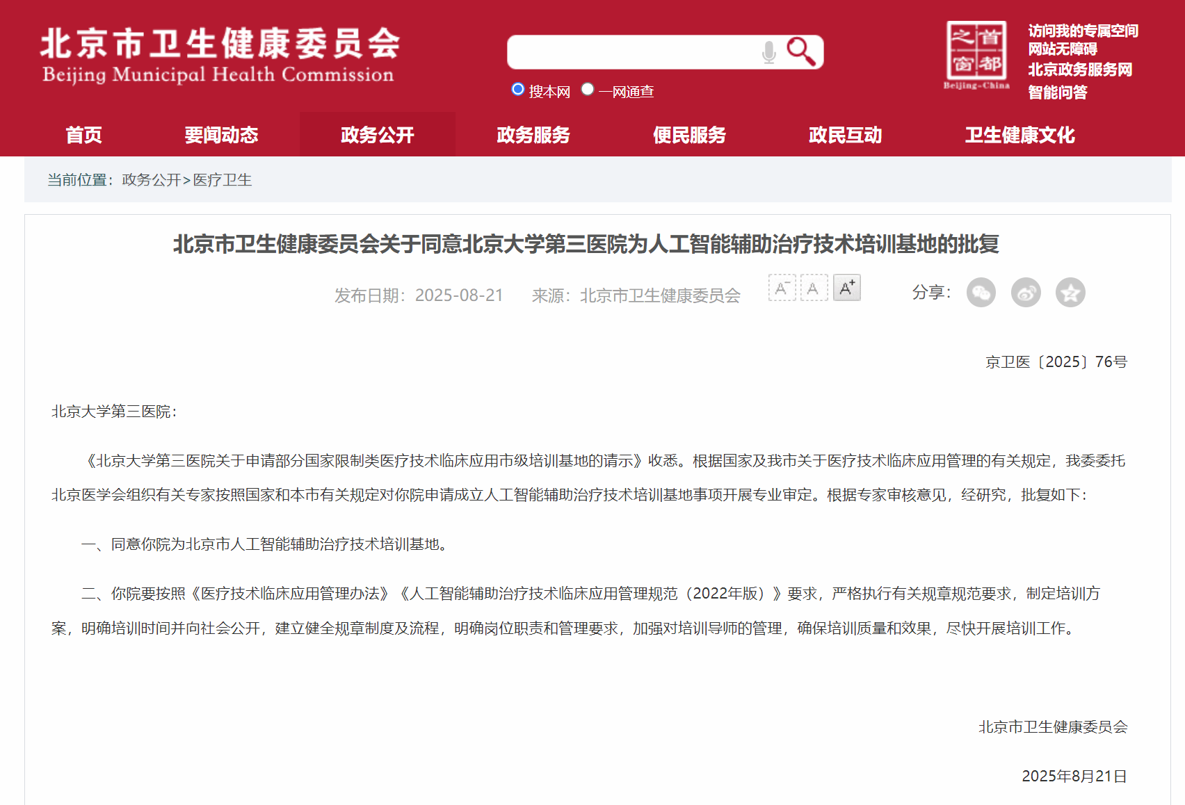 2025年8月21日,北京市衛(wèi)生健康委正式批復(fù),同意北京大學(xué)第三醫(yī)院為北京市人工智能輔助治療技術(shù)培訓(xùn)基地。該基地的獲批標(biāo)志著北京大學(xué)第三醫(yī)院在智能外科領(lǐng)域的技術(shù)實(shí)力與教學(xué)能力獲得認(rèn)可,將為北京市乃至全國培養(yǎng)高素質(zhì)的醫(yī)療人工智能應(yīng)用人才提供重要平臺(tái)。