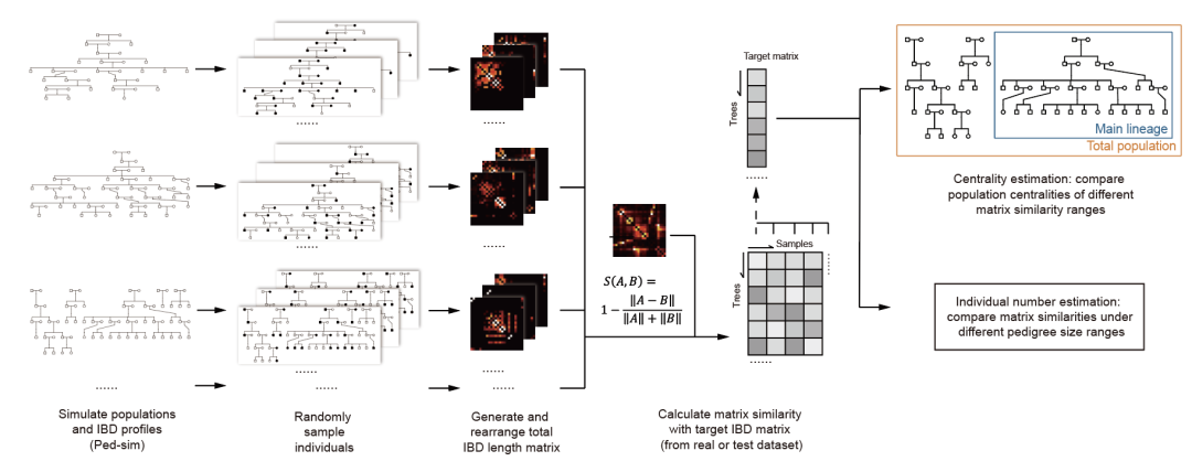 由于M13墓中的個體是二次埋葬,可能存在采樣不全和隨機性等問題,而且人骨保存情況普遍較差只能獲取到墓中部分個體的全基因組數(shù)據(jù),很難通過傳統(tǒng)的親緣關(guān)系推斷方式構(gòu)建完整家系結(jié)構(gòu)。本研究建立了一種基于IBD共享模式和家系模擬的模糊推斷方式用于從稀疏采樣的M13樣本集中提取有關(guān)親緣結(jié)構(gòu)的信息,并估計其所屬社群的總?cè)藬?shù)范圍等。統(tǒng)計模擬結(jié)果推斷M13墓中的個體來自于男性血緣鏈接主導(dǎo)的單一家系(高于75%的后驗概率下),其總?cè)丝谝?guī)?赡艹^200人(高于85%的后驗概率下)。考古學(xué)的一種代表性觀點認為仰韶文化晚期這種大型二次合葬墓盛行的原因可能是為了逝去的家族成員團聚而重新埋葬,以強化本家族以血緣為紐帶的凝聚力,增強后代對家族的認同等。本研究首次利用分子人類學(xué)與遺傳學(xué)實證支持了這一猜測,實現(xiàn)了有關(guān)人類早期社會組織探究的新突破。