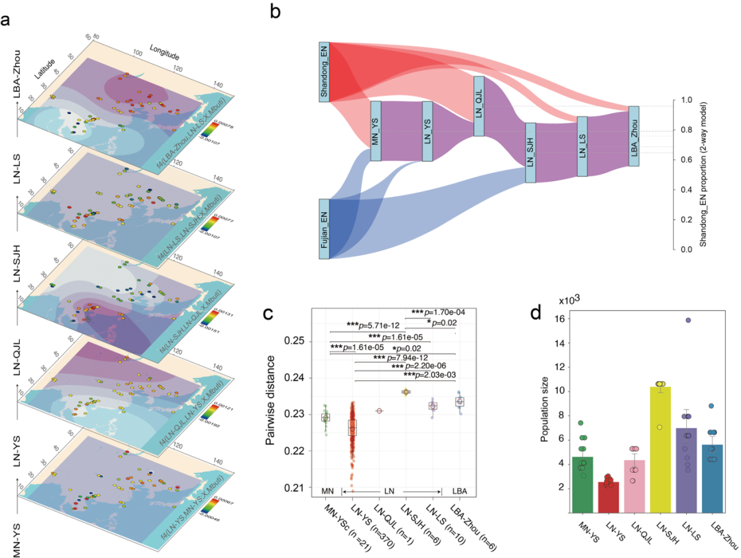 圖2. 八里崗人群的遺傳結(jié)構(gòu)與祖源成分的動態(tài)變化